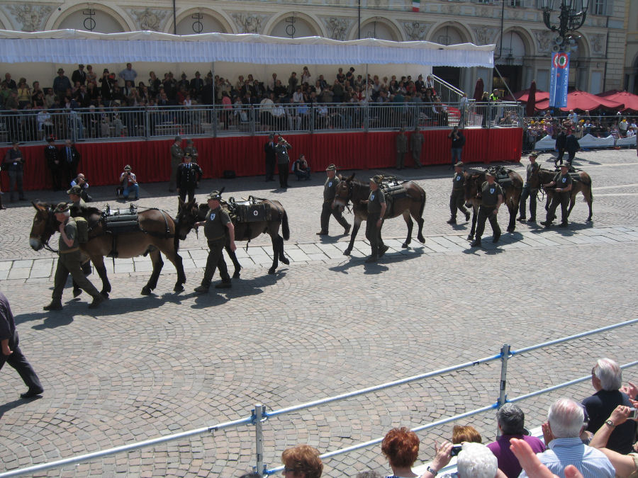 sfilata la vedranno, almeno fino al nostro passaggio. Giungiamo all'ammassamento con buon anticipo sull'orario consapevoli che, come sempre accade, l'attesa per la partenza sarà piuttosto lunga. Ci organizziamo un po', trovando posto in uno degli stand enogastronomici presenti sul luogo, dove approfittiamo anche per un brindisi in compagnia anche del Presidente della Sezione, Luigi Casagrande, che come sempre viene a trovarci e scambiare due parole. L'attesa passa anche con qualche canto, finché, finalmente, cominciamo a muoverci; è il momento di affrontare anche questa sfilata con il solito spirito, felici di essere presenti, orgogliosi di sfilare davanti al palco d'onore dove si sono le autorità, ma soprattutto davanti alle decine, centinaia di migliaia di persone, giunte da tutta Italia oltre che di Torino, che applaudono dall'inizio alla fine (ben dodici ore durerà la sfilata), fino a spellarsi le mani. Si "marcia" inquadrati quanto meglio possibile, e applaudiamo a nostra volta il pubblico che gremisce le transenne lungo tutto il percorso. Ma, per quanto sia lunga, la sfilata termina sempre troppo presto, ed eccoci riuniti in un bar per un brindisi, di nuovo a cantare in mezzo alla gente che scatta fotografie. Il bravo Lino ci aspetta però di là del ponte sul Po per riportarci alla palestra che è il nostro alloggio; ci arriviamo in breve tempo e, in attesa della cena ne approfittiamo per una doccia e un riposino, che non guasta mai. La serata prevede la cena in un ristorante torinese che alcuni della compagnia hanno avuto modo di visitare la sera precedente e del quale dicono molto bene. Vista la distanza da dove ci troviamo (nella parte opposta della città), ci andiamo in pullman. Il ristorante è bello, caldo, tranquillo; il menù è buono, come pure il servizio. Il prezzo è, ovviamente, commisurato... Anche la cena è finita;